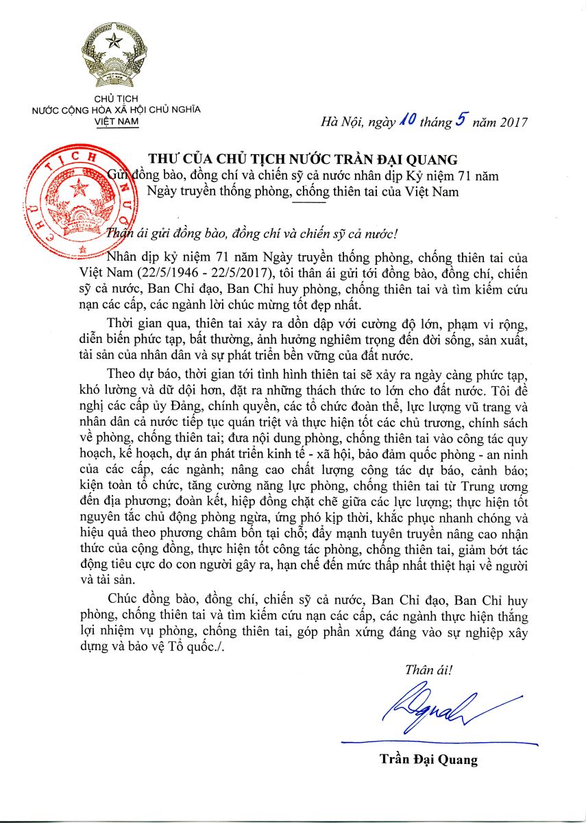 Nhân dịp kỷ niệm 71 năm ngày truyền thống Phòng, chống thiên tai của Việt Nam (22/5/1946-22/5/2017), Chủ tịch nước Trần Đại Quang có thư gửi đồng bào, đồng chí và chiến sĩ cả nước, Ban chỉ đạo, Ban Chỉ huy phòng chống thiên tai và tìm kiếm cứu nạn các cấp, các ngành.